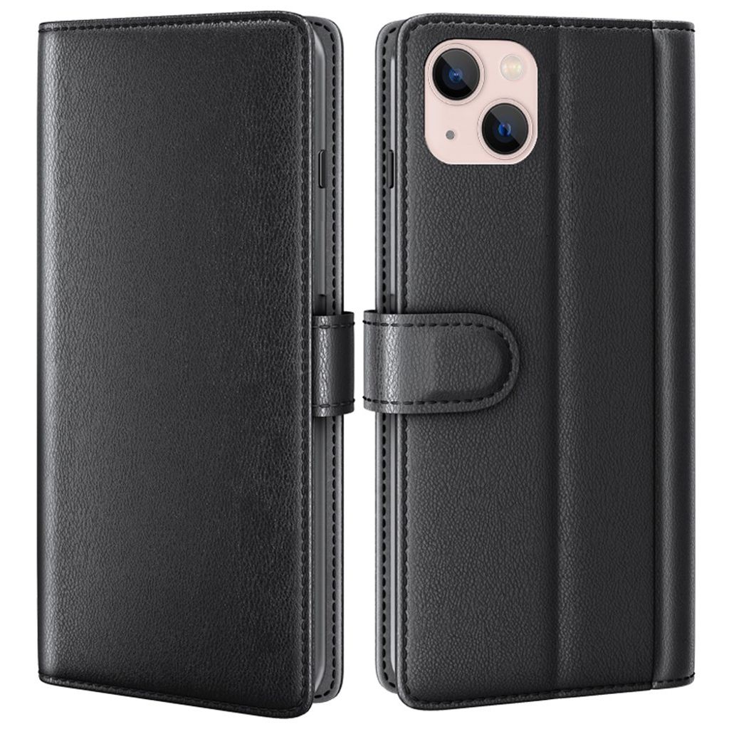 iPhone 14 Lommeboketui Ekte Skinn Med Stativ - Svart